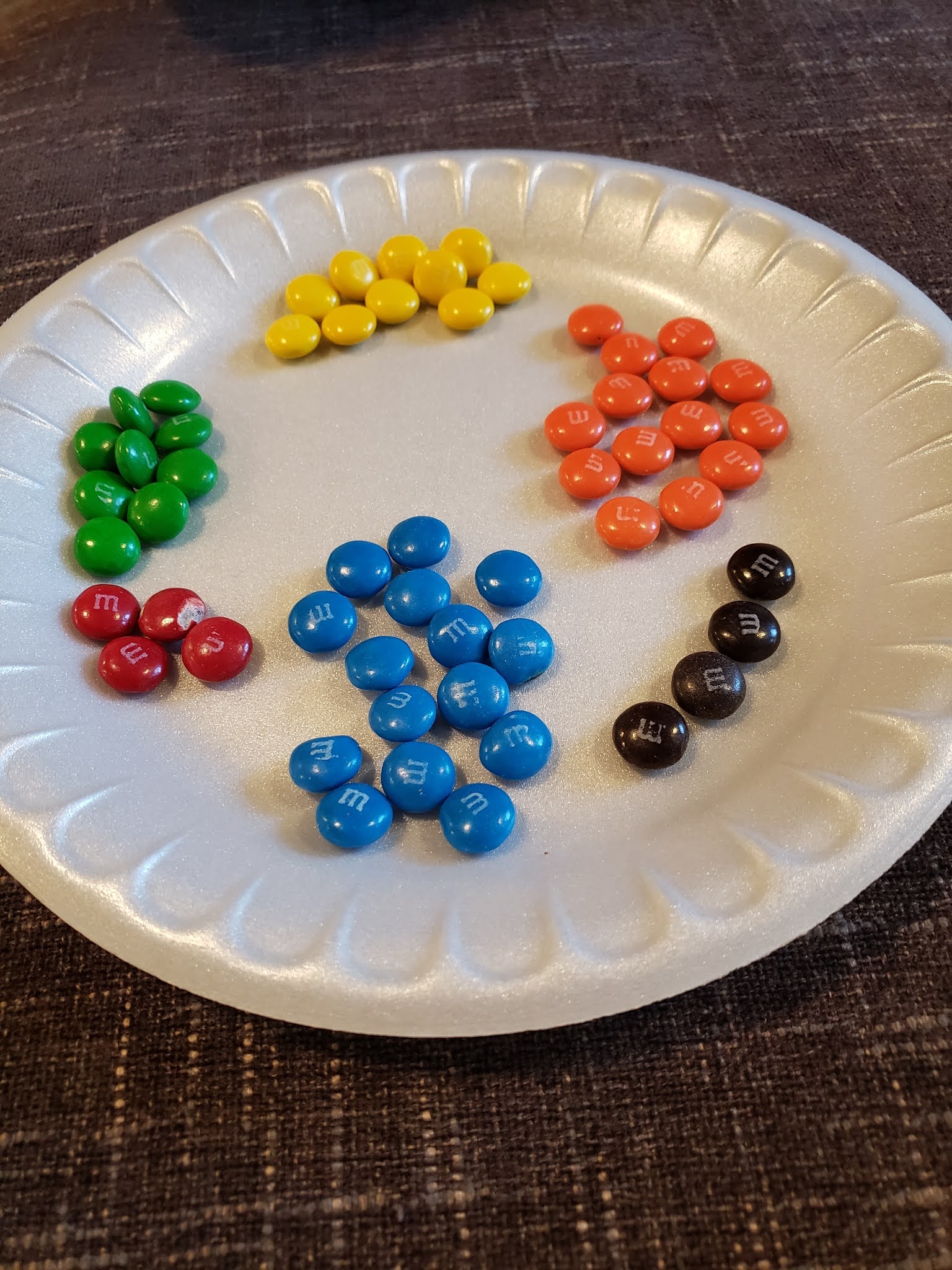 When that is done, give them the last page of the printout for them to fill in the graph. This will help them see the different amounts next to each other and better see what amounts had more or less than the other colors. After that have them answer the questions next to the chart. You can then have them discuss their different answers and why some of the students got different answers than others.